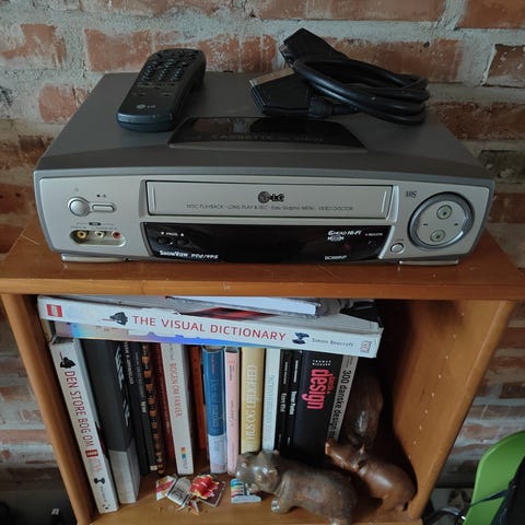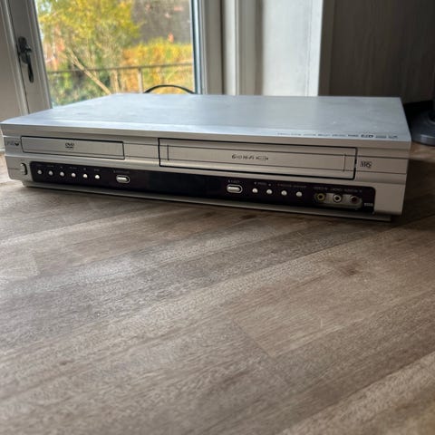 OBS: VHS-afspiller afspiller, men kan ikke spole tilbage. DVD-afspiller vil ikke læse disc. Fjernbetjening medfølger og virker.