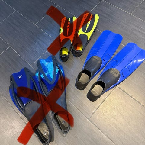 Fluyd svømmefødder i blå og sort farve, størrelse 42-43 svarende til en rigtig størrelse 44-45. Fremstillet med lukket fodlomme og materiale egnet til svømning og snorkling. Designet til brug for voksne.