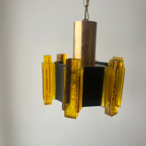 Materialer inkluderer metal og transparent gul akryl. Evt. sms på 61283824 Marie Andersen