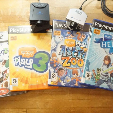 Diverse Eye Toy spil til 25 kroner stykket og originale EyeToy kameraer til 50 kroner stykket. Begge passer til Playstation 2 PS2.