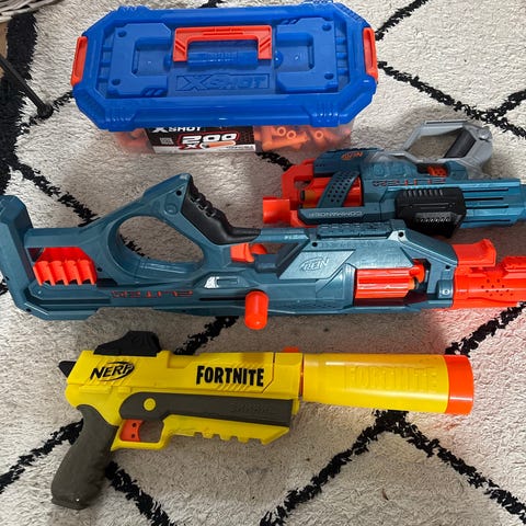 Nerf Elite og Fortnite Blastere Legetøjssæt bestående af flere forskellige modeller i farverne blå, orange, hvid og rød. Materialet er plast, og sættet er designet til børn. Blasterne inkluderer forskellige størrelser og funktioner, egnet til leg og samling.