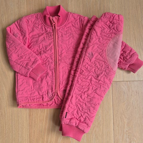 Molo termosæt i størrelse 134-140 til piger. Sættet består af en lyserød/beige quiltet jakke og matchende quiltede bukser med elastik taljen. I Molo’s kendte kvalitet med forstærkninger på knæ og rumpe samt refleksstjerne.