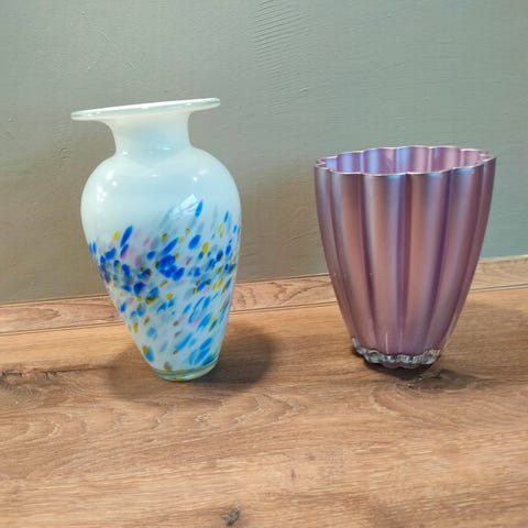 Hvide. Sættet indeholder tre vaser. Kan købes enkeltvis for 40 kr.