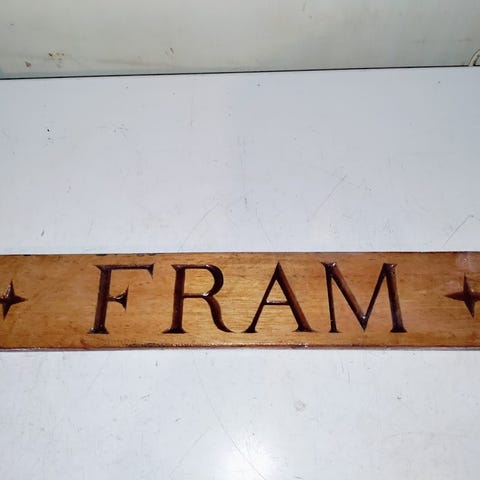 Skibsskilt “Falken” fra båd – sirligt udskåret i fyr, malet og lakeret