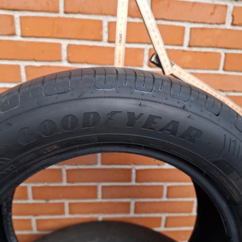 Dækkene er kun ét år gamle og har kørt ca. 4000 km, så der er masser af mønster tilbage (målt omkring 6–7 mm).