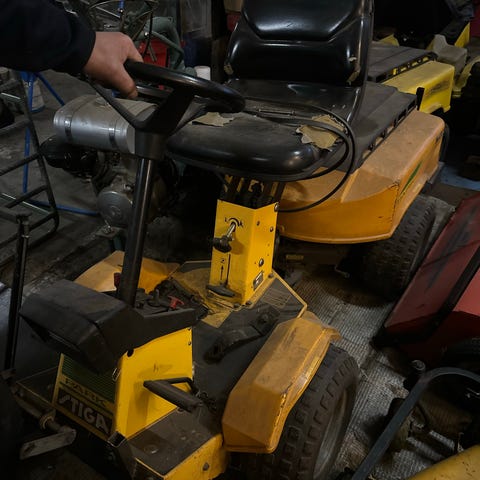 Stiga Park Prestige plænetraktor med frontmonteret 110 cm klippebord. Traktoren er gul og grå og har en komfortabel førerplads med justerbart sæde. Udstyret med kraftig motor og stor brændstoftank. Velegnet til effektiv græsslåning på større arealer.