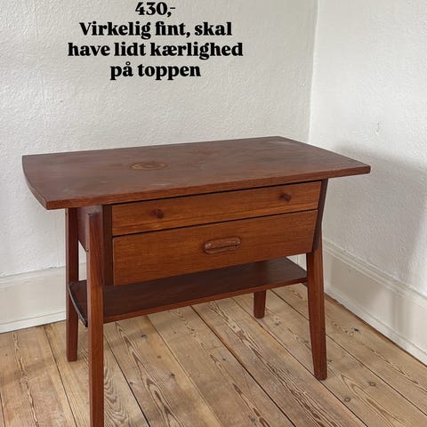 Smukt retro sybord eller natbord/sengebord i teak eller mahogni. Skal have en gang olie. Brugsspor på øverste plade og små skader på kurven. Se fotos.