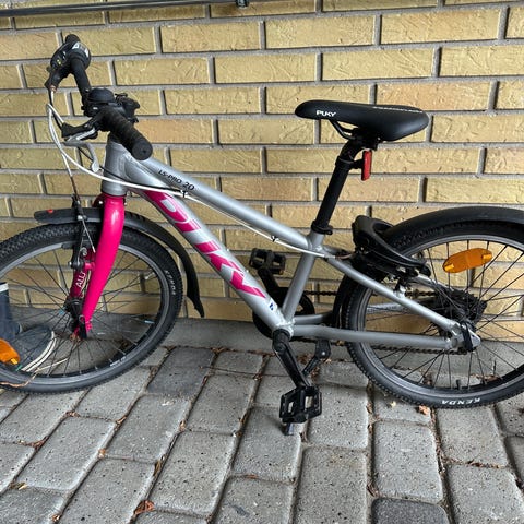 Børnecykel i str. 20 tommer (hjul) med 3 gear - som dog ikke fungerer særligt smidigt. Det skifter gear af sig selv, og selv i første gear er det noget tungt at træde rundt.