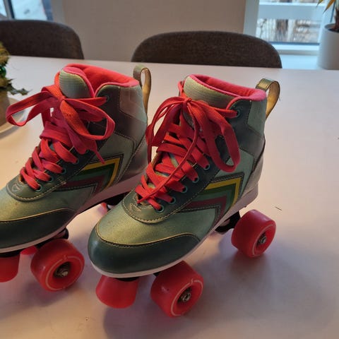 Skøjterne er brune med lilla snørebånd og dekorative hjerter.