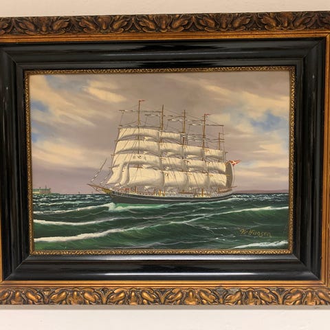 Maleri af skoleskibet København med sejl og dansk flag i guldramme.