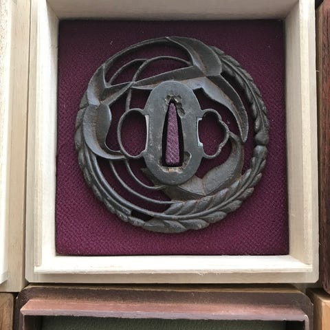 Tsuba (håndbeskytter til Katana sværd), Japan - Edo perioden (1600-1868), Choshu Skolen, jern, maru gata form med skåret design (sukashi) af plante og blomst (pæoner), mål: 80 mm x 78 mm x 5,5 mm. Vægt 101,5 g uden æske. Æske i Paulownia træ (kejser træ) medfølger.