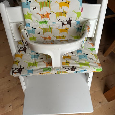 Stokke højstol med hvidt sæde og fodstøtte samt ben i valnødde træ. Designet til børn med fokus på komfort og stabilitet. Højstolen er velegnet til brug ved spisebordet og kan justeres efter barnets behov.