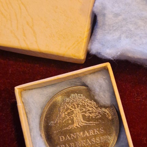 Danmarks sparekasser i sølv 0,800 den store ca 26,5 gram og sjældne af dem i original æske. Oplag under 1000 stk.