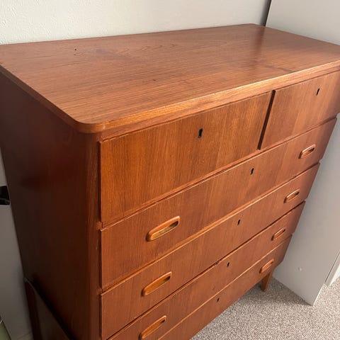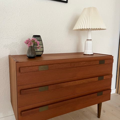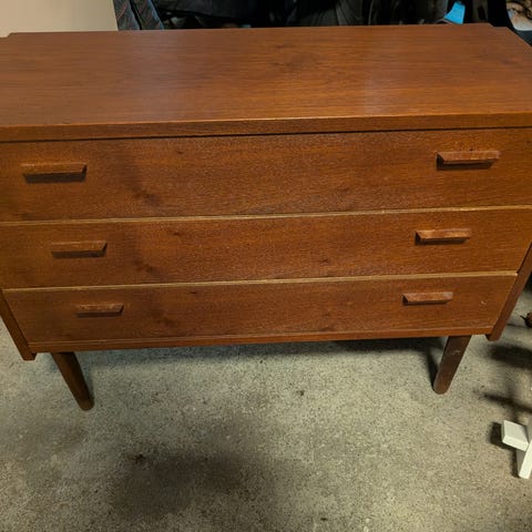 Dansk 60’ er design: teakskab med tre skuffer i bunden og to skydelåger øverst med en hylde bag lågerne. Skabet har en mellemhylde under skydelågerne. Ingen bud tak. Henvendelse på sms: 22804812