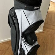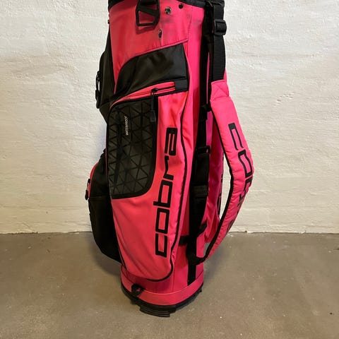 Cobra vognbag. Virkelig velholdt, elegant ca.80 cm høj. Mange lynlås rum og andre rum til trøjer m.m. Cover foroven. Alt meget velholdt. Ikke brugt særligt meget. Utallige, faste rum til køller ca.20 x23 cm. Lille tilhørende taske med lynlås rum. Kan hægtes på bag.