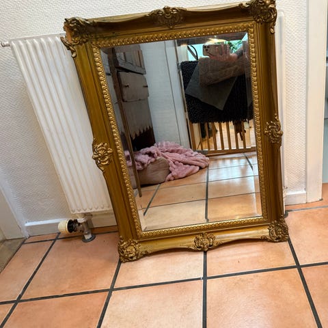 Sødt ovalt spejl. 55.5 x 45 x 4. I pæn stand. Kan også hænge på langs