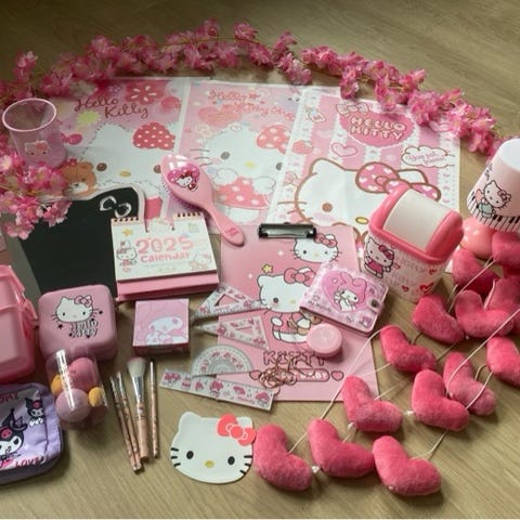 Hello Kitty legetøjssæt bestående af forskellige små figurer og tilbehør i lyserøde, lilla og gule farver. Sættet indeholder blandt andet møbler, små figurer og diverse legetøjsdele egnet til børn.
