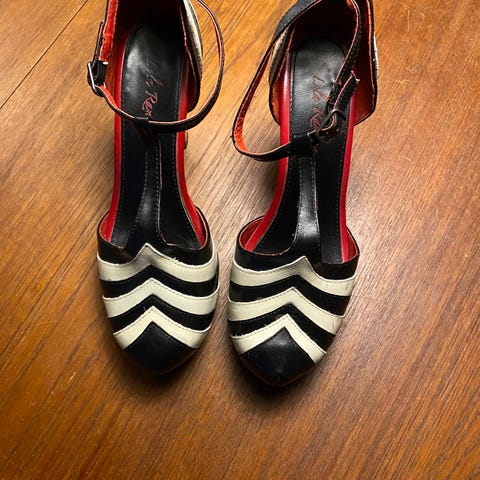 Smukke Lola Ramona stiletter i rød/hvid/sort. Desværre er noget af lakken skallet af, men kan sagtens fikses.