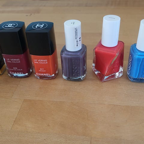 Sælger hermed 25 stk neglelak fra forskellige mærker f.eks Chanel, nailkind, golden rose, nail Berry og 12 læbestifter fra forskellige mærker r.eks 8 Mac 1 inglot 1 gosh 1 cdoa de er brugte og derfor sælges de billigt
