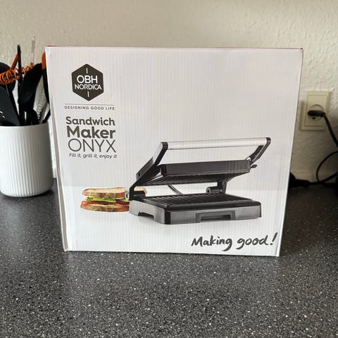 DAY Sandwich Maker med sort plast og metalplader, designet til at lave 2 sandwiches ad gangen. Har indikatorlamper for strøm og klar til brug. Strømtilslutning via ledning. Kompakt og bærbar model.