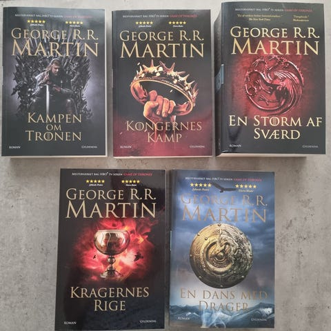 George R.R. Martin A Storm of Swords bog på engelsk. Romanen er en del af fantasyserien og indeholder 973 sider. Bogen er i paperback-format med blå omslag og illustreret forside med et sværd.