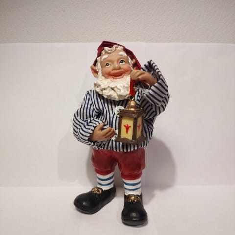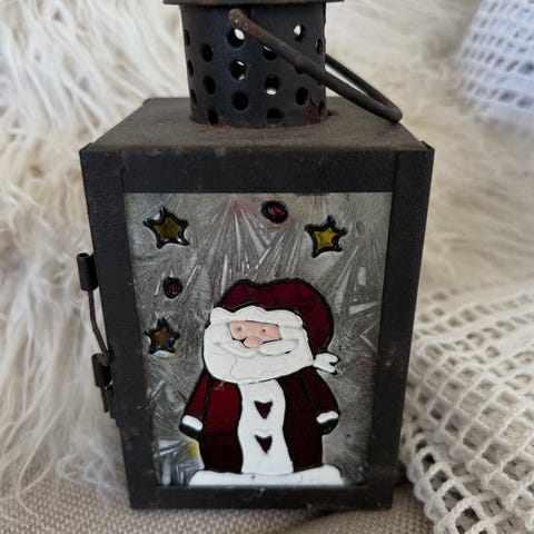 Sød gammeldags julelygte -julelanterne med gammeldags julemotiv af julemænd og nisser. Den er til fyrfad hvor man skruer i buden så lys kan sættes ind. Den kan sendes elller afhentes på adressen