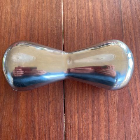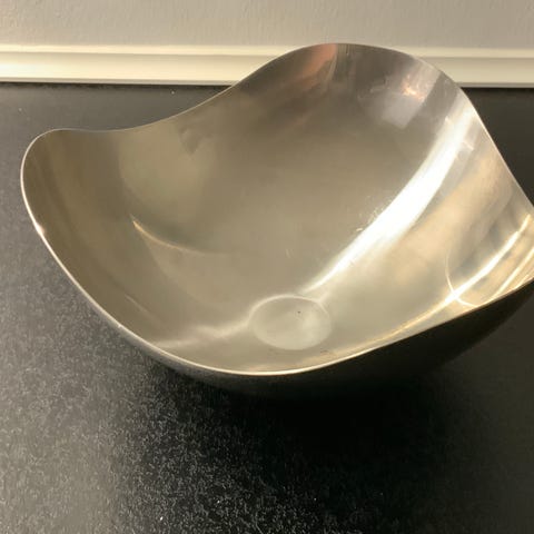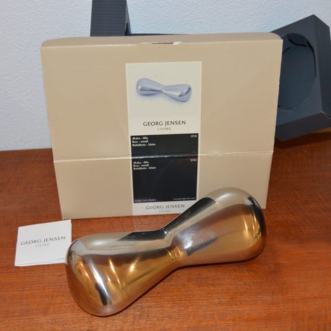 Georg Jensen Stelton smykkeskrinlavet af rustfrit stål. Skålen har en unik timeglasform og leveres med en hvid plastikbakke. Designet af Karim Rashid. 2006. Materialet sikrer holdbarhed og nem rengøring.
