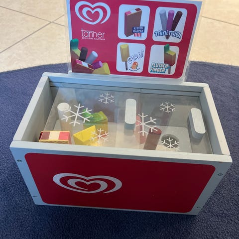 Sød og sjov håndbygget isbutik. Markise og disk til salg af lækre sager. Bag disken er der en hylde til sager. Vi har købt den hos familien, der har bygget den, og nu er den klar til at få et nyt hjem efter mange timers god leg for vores børn.