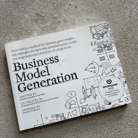 Business Model Generation af Osterwalder & Pigneur med fokus på forretningsmodeller. Indeholder illustrationer og tekst til at hjælpe med at udvikle og analysere forretningsstrategier.