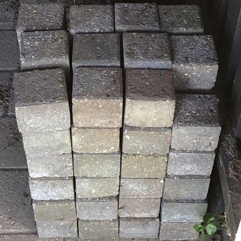 Godt 15 kvm i rødlig nuance. Dem som har ligget udsat for regn har mere slid end dem som har ligget under udhæng. Selvoptag - men jeg hjælper for en india pale ale
