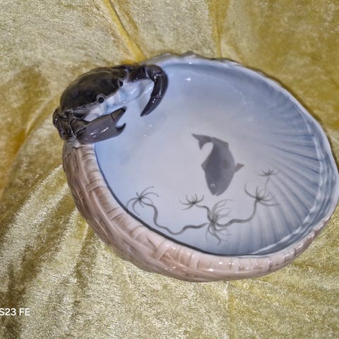 Royal Copenhagen skål med fiskemotiv, fremstillet i porcelæn. Skålen har en rund form med dekorative detaljer og en glaseret finish. Velegnet til servering eller som dekorativt element i køkkenet eller spisestuen. Ø 15 cm.