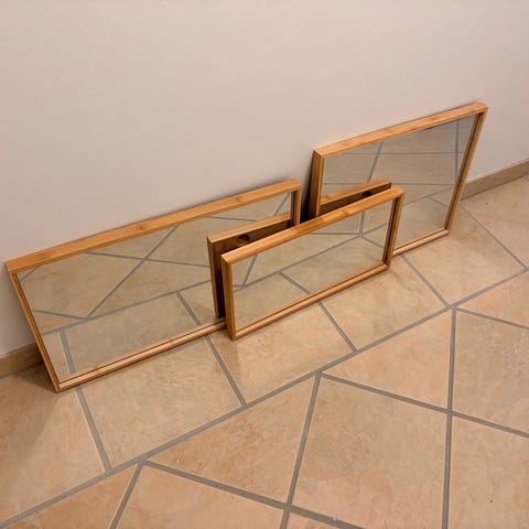 2 trærammer med deko-spejle. Spejlvendt motiver. Måler 25x25x1,2 cm. Vægt 390 gr pr stk.