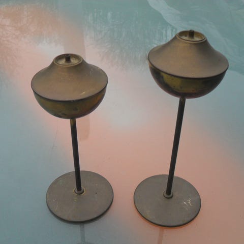 Højde 35 cm og 31 cm med fod diameter 8 cm. Udført i kobber/messing. I fin stand.