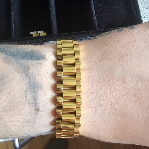 Lilla armbånd med forgyldte halvædelsten. Armbåndet er designet til kvinder og kombinerer forgyldt metal med runde halvædelsten. Produktet leveres med original æske og kvittering, hvilket dokumenterer ægthed og oprindelse.