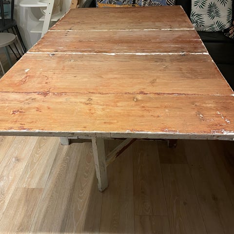 Antikt spisebord af massivt, hårdt træ. Benene kan skrues af. så bordet - trods sin størrelse - kan komme ind næsten over alt. Tilsvarende borde handles på auktioner for 8-15k.