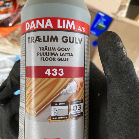 En næsten fuld 10 l. spand med lim til at lime venyl gulv fast og to tandspartler 2a som er perfekt til at smørre limen ud.