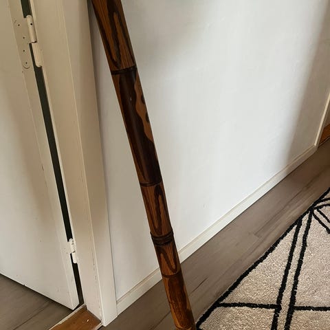 Håndlavet didgeridoo i træ med dekorativ maling. Instrumentet har en naturlig træfarve med brune og gule mønstre samt en sort og hvid malet mundstykke. Kan anvendes som musikinstrument.