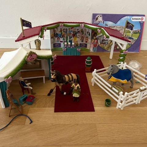 Schleich Park World legetøjssæt med heste, ryttere, forhindringer og tilbehør. Sættet inkluderer flere figurer og elementer til leg med heste, egnet til børn. Materiale og størrelse ikke specificeret.