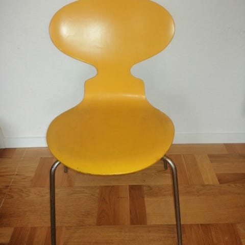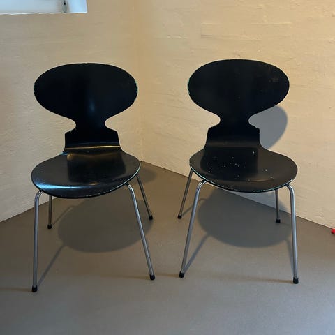 Arne Jacobsen ‘Myren’ stol af formpresset finer, model med fire ben, sortlakeret skal med stel af forkromet stol, pæn og velholdt stol, helt fast i ryggen. Model 3101. fremstillet hos Fritz Hansen