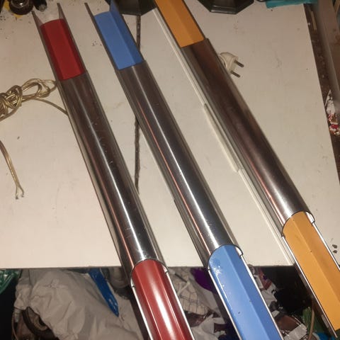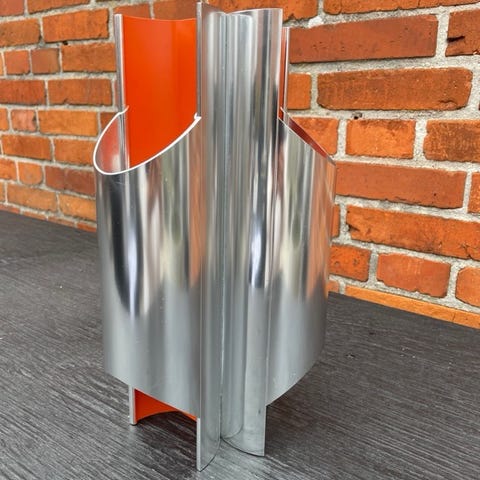 Bent Karlby. væglamper af poleret og bemalet aluminium rød/orangelakeret. Fremstillet hos Lyfa. L. 60 cm.