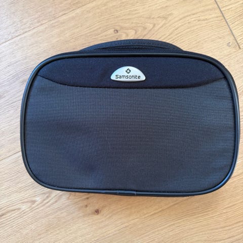 1 - praktisk ubrugt mørkegrå/ sort Samsonite rejsetoilettaske lavet af stof, designet til unisex. Tasken har flere rum med lynlåse