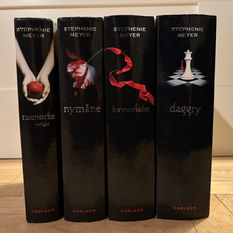 De 4 bøger i twilight sagaen af Stephenie Meyer udgivet af Carlsen. Bøgerne er på dansk.
