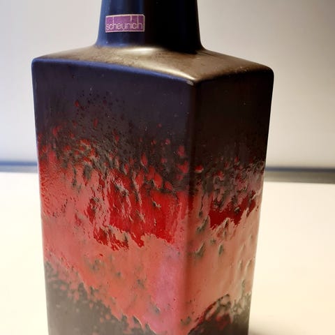 A fine example of the West German “Fat Lava” ceramic style, produced by Scheurich Keramik in the 1960s–70s. The vase features a cylindrical form with strong contrast between its glossy, blood-red central glaze band and the heavily textured black and grey “lava” zones at the base and rim. This dramatic surface treatment reflects the experimental glazes and bold palettes that made West German ceramics internationally distinctive during the postwar design boom.