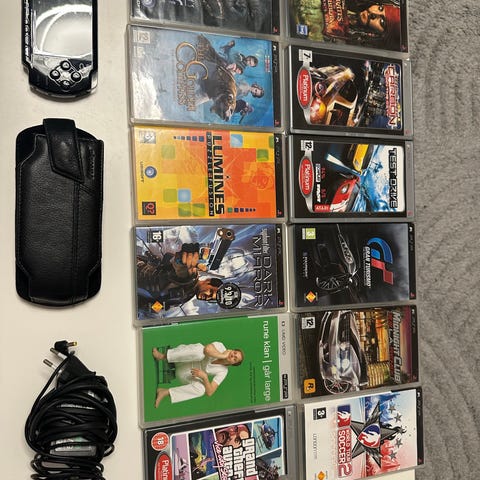 Sony PSP konsol med tilbehør inklusive taske, oplader og biloplader. Pakken indeholder 10 spil: Gran Turismo, Killzone Liberation, Grand Theft Auto, Tekken, og flere. Konsollen har en 4,3 tommer skærm og understøtter trådløs forbindelse. Spil og tilbehør er velegnet til underholdning på farten.