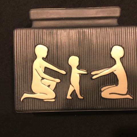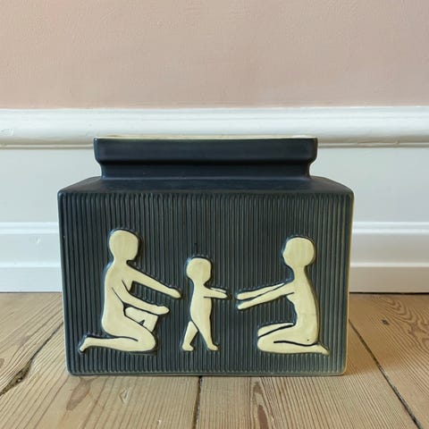 Soholm Keramik Vase i triangulær form med sort og salviegrøn farve. Dekorativt relief med en voksen person og 2 børn. Fra serien " Dig og mig" fra 1950erne. Elegant form. H 20 cm. Hvert ben i trekanten er 9 cm.