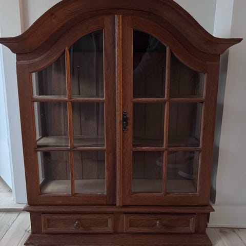 Smuk antik skab i massivt træ med udskæringer og glasdetaljer