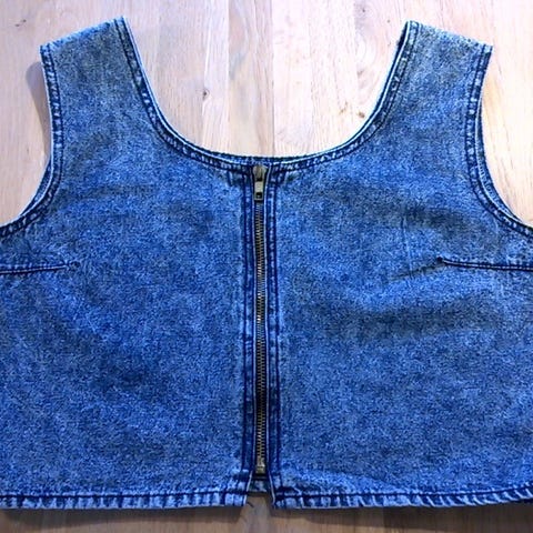 Girl denim vest 14år, S, 36 (jeg har brugt den S/M). 100% bomuld med lynlås som kan åbnes helt. Bryst 94cm. Længde 33 cm. Brugt men god, ingen fejl og mangler. Vejer 112g.