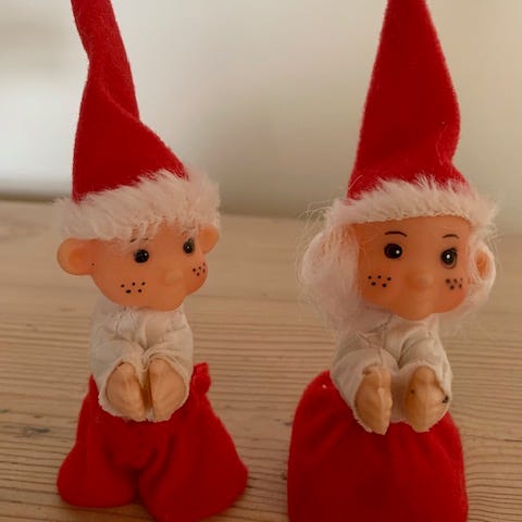 De måler henholdsvis 7,8 og 11 cm. Som det ses på billedet mangler der en hue. Nissepiges kjole sidder løs.