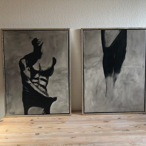 Kunstmaleri med kontur af kvindefigur i blå nuancer. Maleriet viser en stiliseret fremstilling af en kvindekrop, hvor farverne og penselstrøgene skaber en dynamisk og udtryksfuld effekt. Velegnet til dekoration i moderne hjem. Akrylmaleri, Antoni Adamski, b: 60 h: 80, Antoni Adamski (f. 1955). Komposition med model. Signeret Adamski. Uindrammet