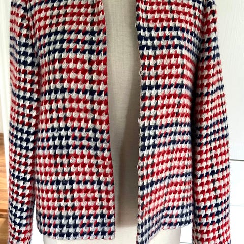 Co'couture kvinde jakke i størrelse XS med sort farve og mønster i hvid. Jakken har lange ærmer og en rund halsudskæring. Materialet er ikke specificeret, men jakken har et dekorativt broderet design.